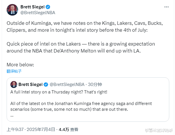此外,西格尔还表示,如果比尔效仿利拉德的做法完成合同买断,他将成为各队争抢的自由球员,届时多支球队会希望以底薪合同签下他。热火、湖人、快船、勇士和雄鹿等队均有意以小额合同引进比尔。