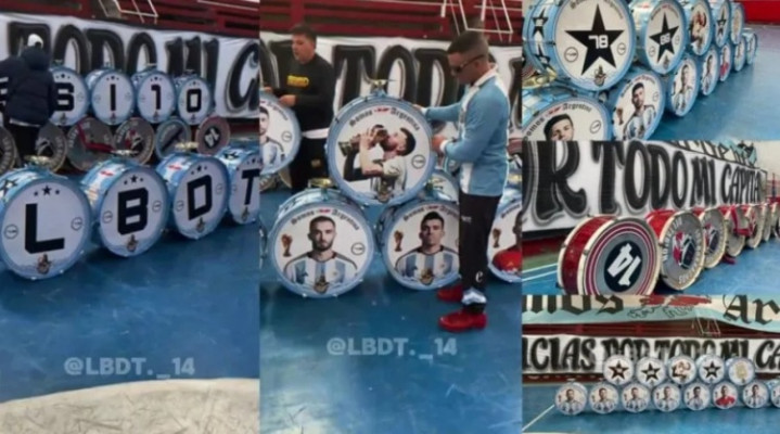 一些鼓背面还印有“Messi”字样或LBDT缩写,此外,还有四个鼓上印有马尔维纳斯群岛和国旗的颜色。他们还计划偷偷带入一些河床队颜色的传统鼓,但能否成功尚不确定。现场还将有一面新的横幅,上面写着“非常感谢队长”,一侧是酒瓶标志和14号数字,另一侧则是梅西亲吻奖杯的画面。
