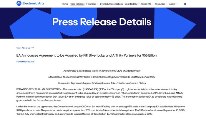 根据协议,艺电现有股东将获得每股210美元的现金,与收购传闻出现前的最后一个交易日(当地时间9月25日)收盘价168.32美元相比,溢价达25%。