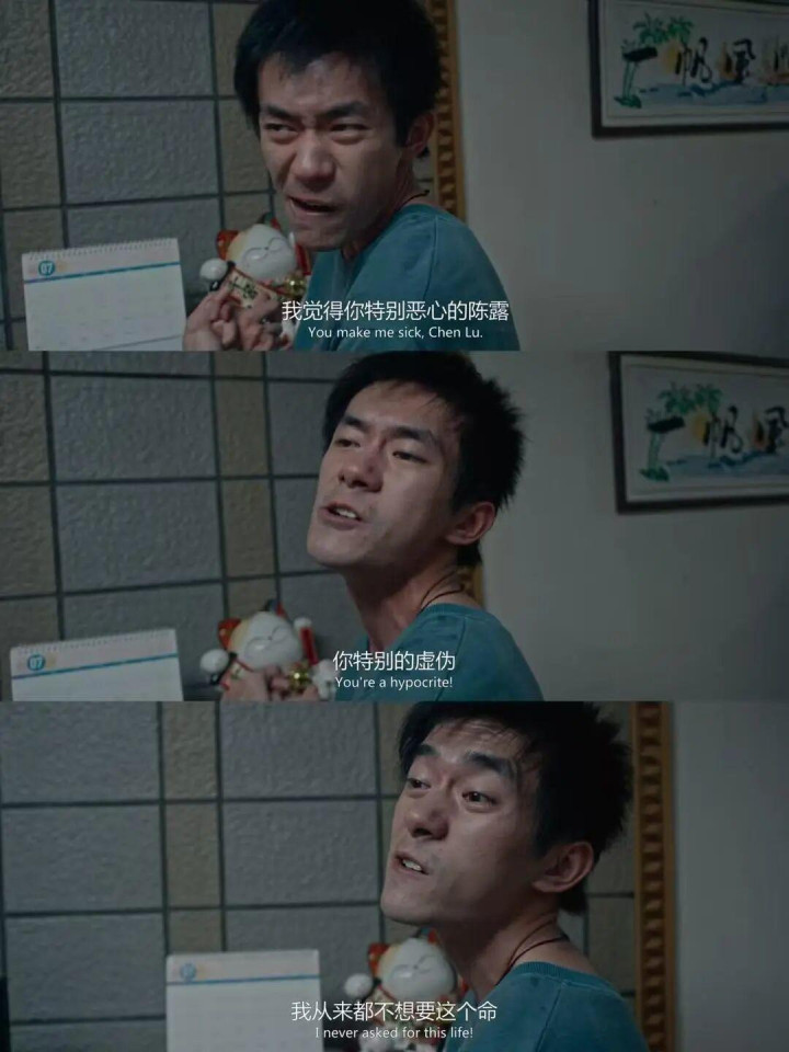 这一段表演,从台词到形体,从表情到眼神,完美地演绎出一个人的颤栗、惊慌、悲愤、痛苦与紧绷多年的弦将要断裂的绝望感。
