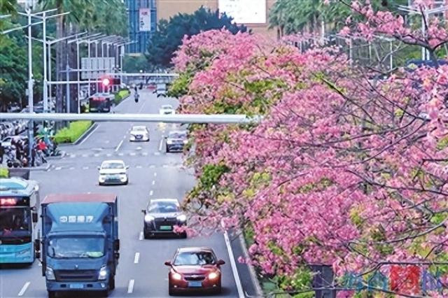 天气渐凉,大腹木棉的枝头却热闹起来。沿沧林路缓步前行,映入眼帘的皆是粉色。这里的大腹木棉已进入盛花期,在暖阳映衬下,层层叠叠的粉色花朵铺满枝头,为经过的车辆撑起一把把粉色花伞,在流淌的车流中印下斑驳而绚烂的花影。