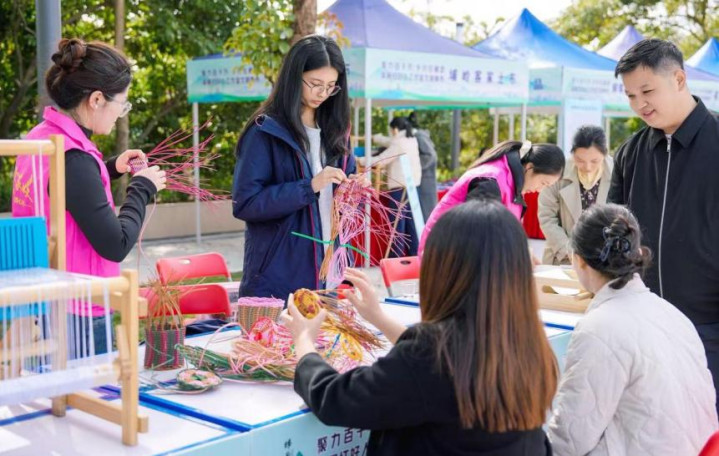 现场还设有织布、手编等互动体验区,参观者通过参与织布、手编制作等互动项目,在实践体验中深化对传统文化的认知。这场集产品展销、文化体验、互动交流于一体的文明集市,既是梯面特色产业创新发展的生动展示,更是“百千万工程”建设成果惠及民间的真实写照。