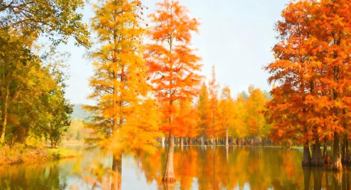 将银杏的金黄、水杉的锈红、枫叶的炽烈、乌桕的斑斓……