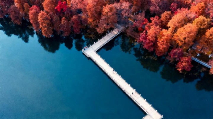 初冬武汉,东湖色彩绚烂,“绿心”正上演变装。枫香道红叶似火,银杏道如长廊。沿湖漫步,可见锈红色水杉林倒映碧波,能听风吹乌桕洒下碎金暖橙。从磨山到落雁,每一步都如穿行油画,山、水、树、城诗意融合。