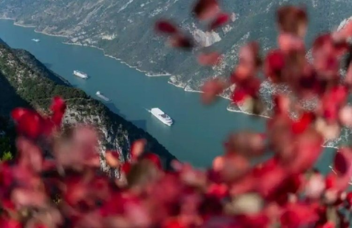从巫山县黄岩景区眺望长江,在红叶映衬下,一艘艘船只航行在三峡,构成一幅美丽画卷。