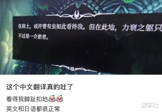 相比之下,前作《空洞骑士》采用的翻译策略就更贴近原文一些,好坏暂且不论,但至少没有这么出戏,也为玩家对这个系列的印象定了个调。这暴露出了另外一个问题:作为续作的《丝之歌》,在翻译上与前作出现了不一致的状况。