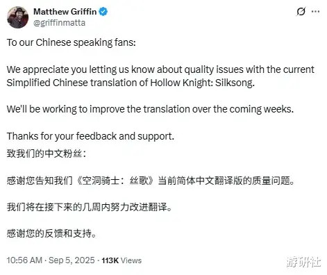 对于简中玩家反应激烈的本地化问题,《丝之歌》的回应倒是没有鸽。Team Cherry的市场营销与发行负责人Matthew Griffin,已经在自己的推特账号上做出了回应:团队将在接下来的几周内努力改进中文翻译问题。