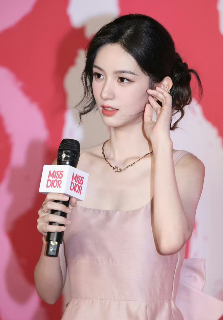 周也淡粉色蓬蓬礼裙搭配后背超大型蝴蝶结装饰,轻盈薄纱材质与柔和色调凸显少女感,冷白皮与立体骨相完美驾驭粉色,融合“千金贵气”与“蜜桃甜软”,成为名场面。