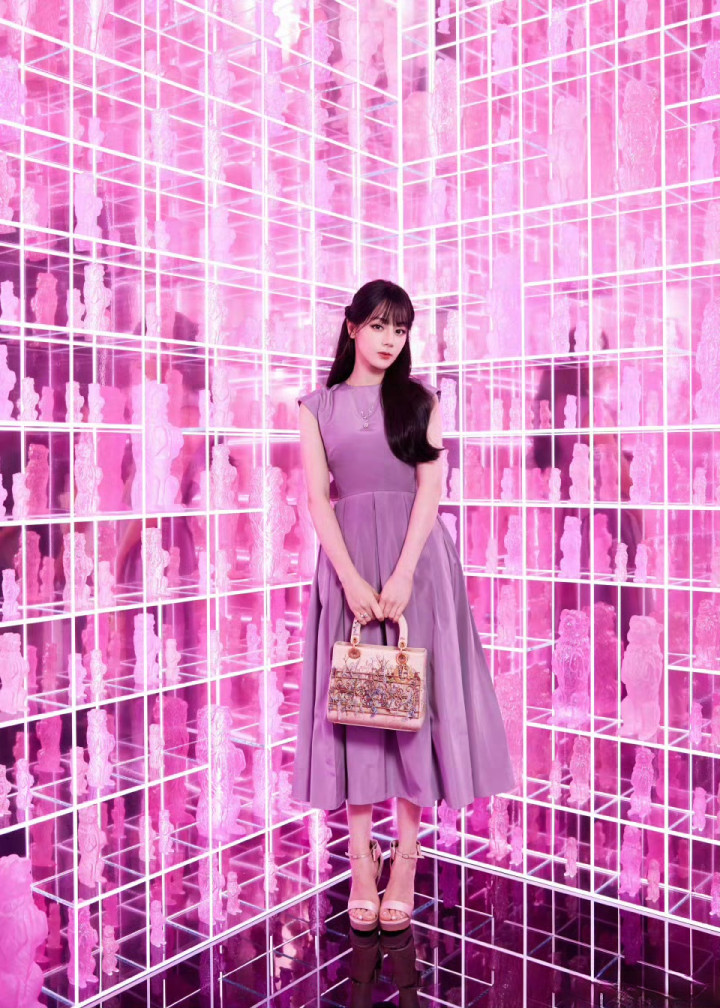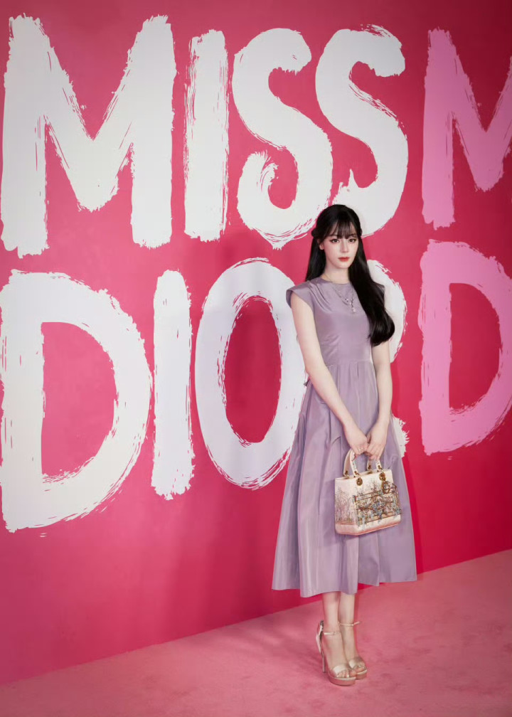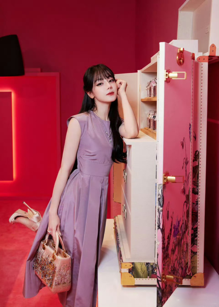 迪丽热巴身着DIOR淡紫色缎面抹胸长裙,头饰与裙身点缀同色系立体蝴蝶结,整体色调柔和浪漫。
