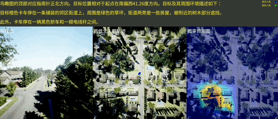话不多说,来看实例。想让无人机“去湖边指定房子附近找到那辆停在树下的汽车”,单台无人机要么飞得太高,看不到树下的汽车;要么飞得太低,顾不上房子、湖泊这些宏观地标。单台无人机在复杂环境中容易迷失方向,但当高低空无人机协同作战,就能快速找到目标: