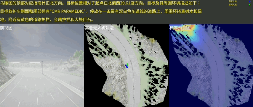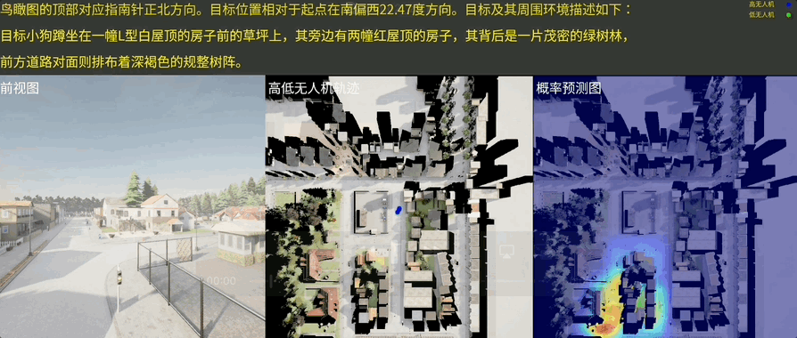 如下三张图分别从“前视图、高低无人机轨迹、概率预测图”角度,展示此方案如何工作: