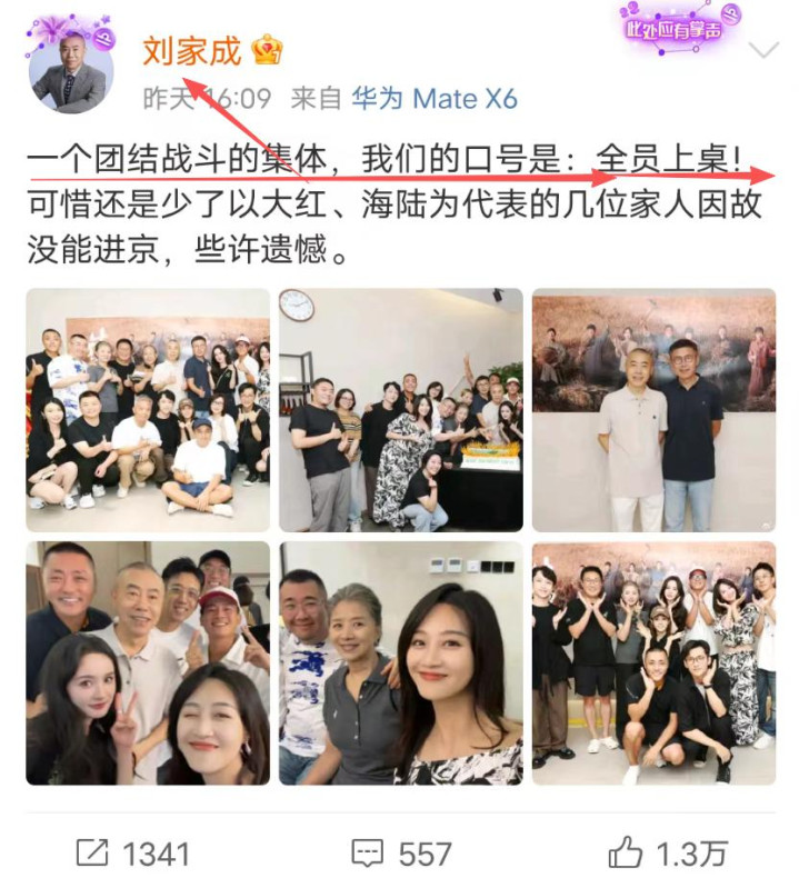 导演刘家成在微博发布《生万物》剧组庆功宴合照,并配文“一个团体战斗的集体,我们的口号是全员上桌!”。