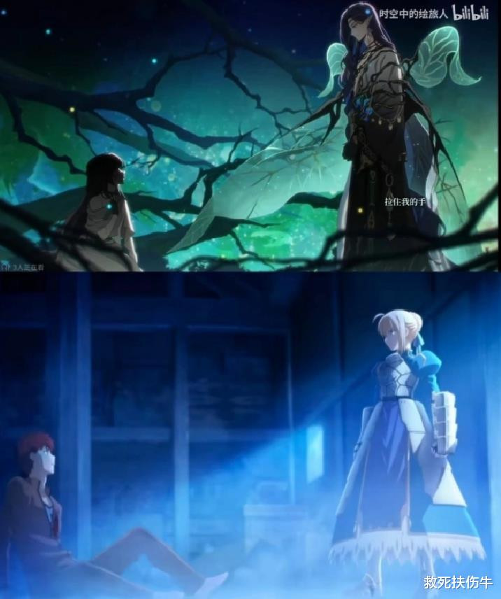 绘旅人这次重点争议倒不是美术,像这类构图和人物形象塑造,其他游戏可以都找到更像fgo的。